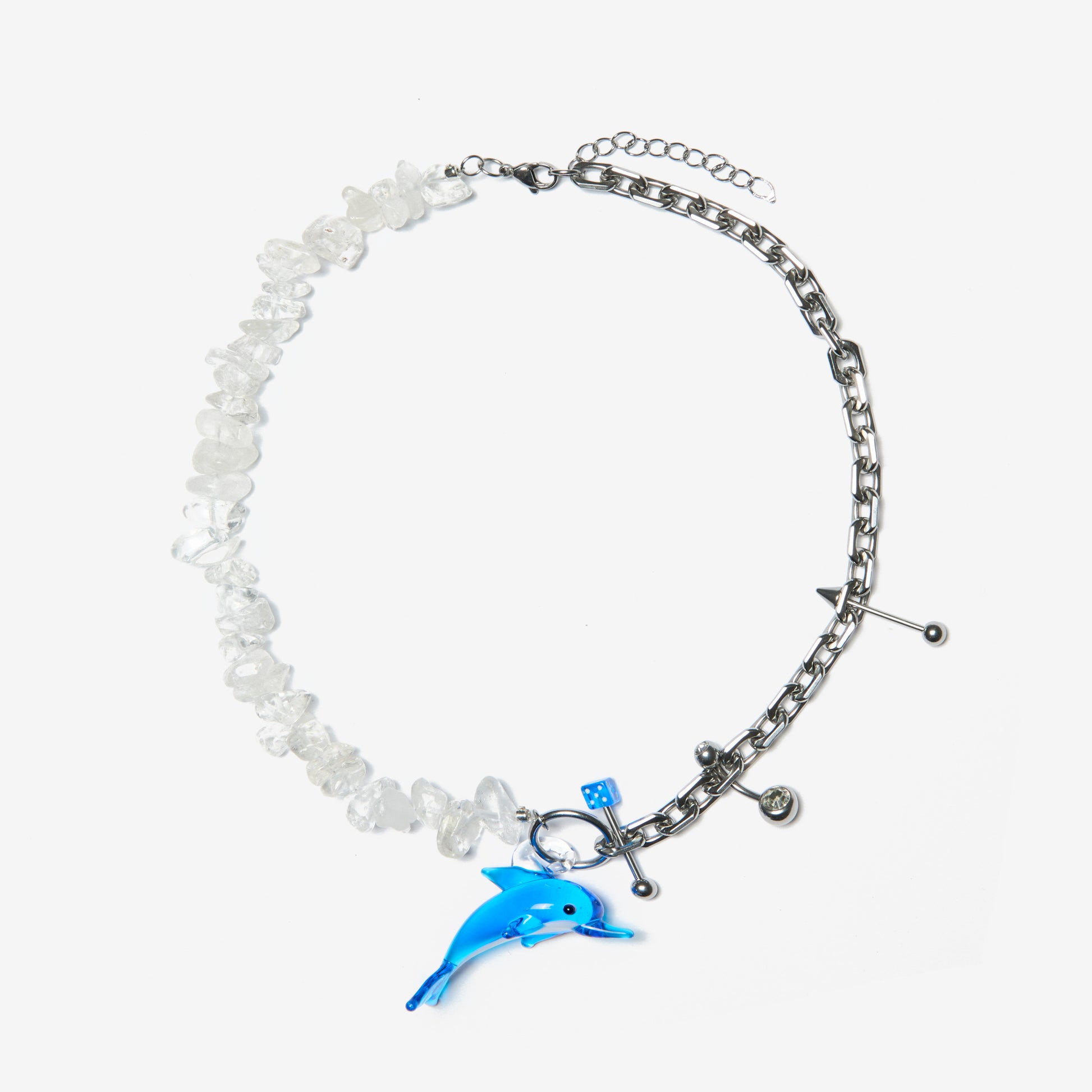 Necklace with silver chain, quartz pearls, piercings and a blue glass dolphin.