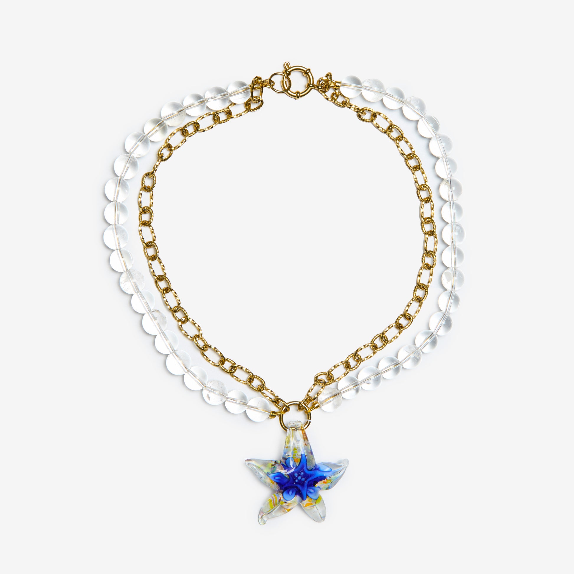 Necklace with a hammered gold chain, quartz pearls and a big glass sea star.