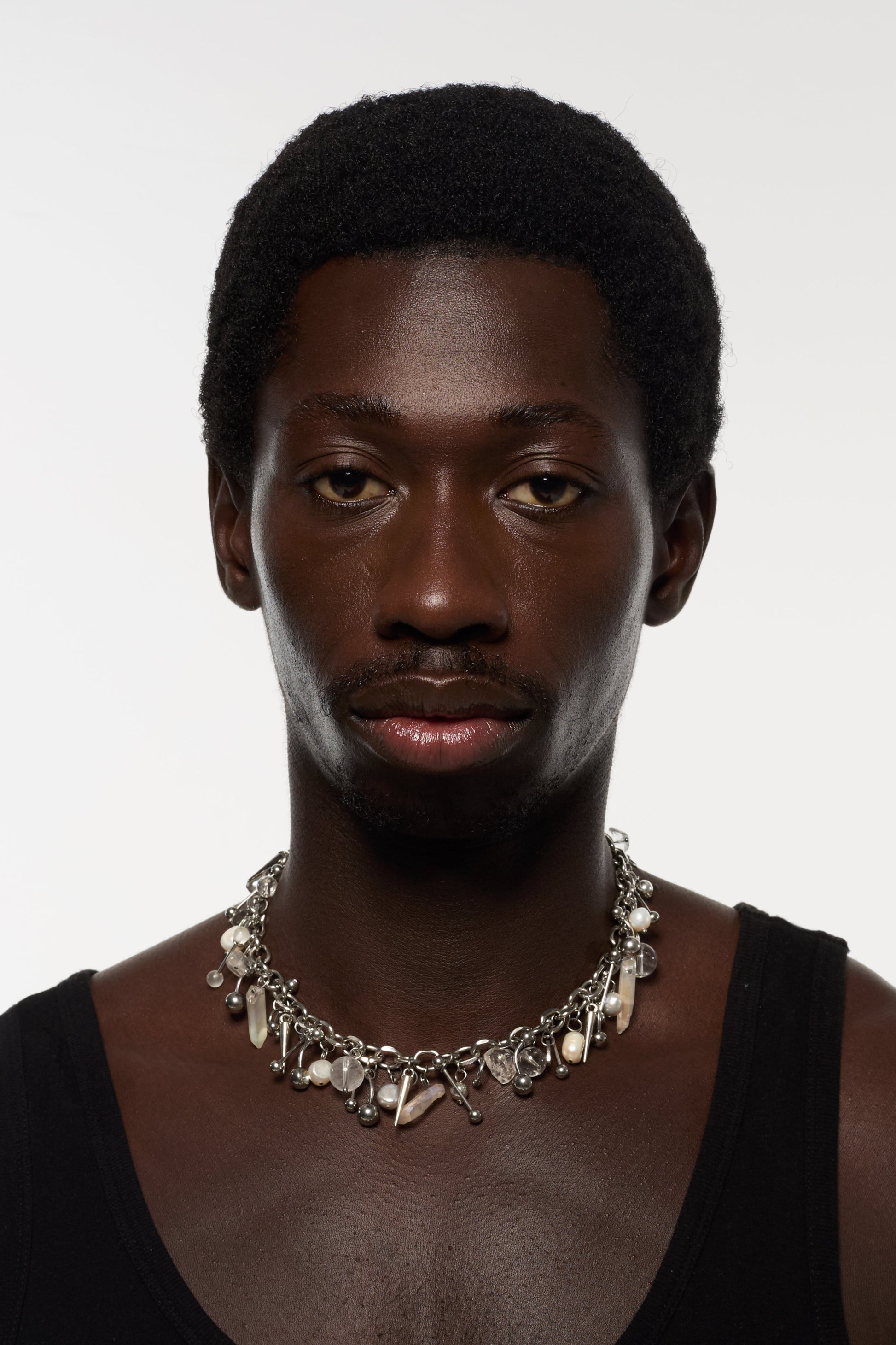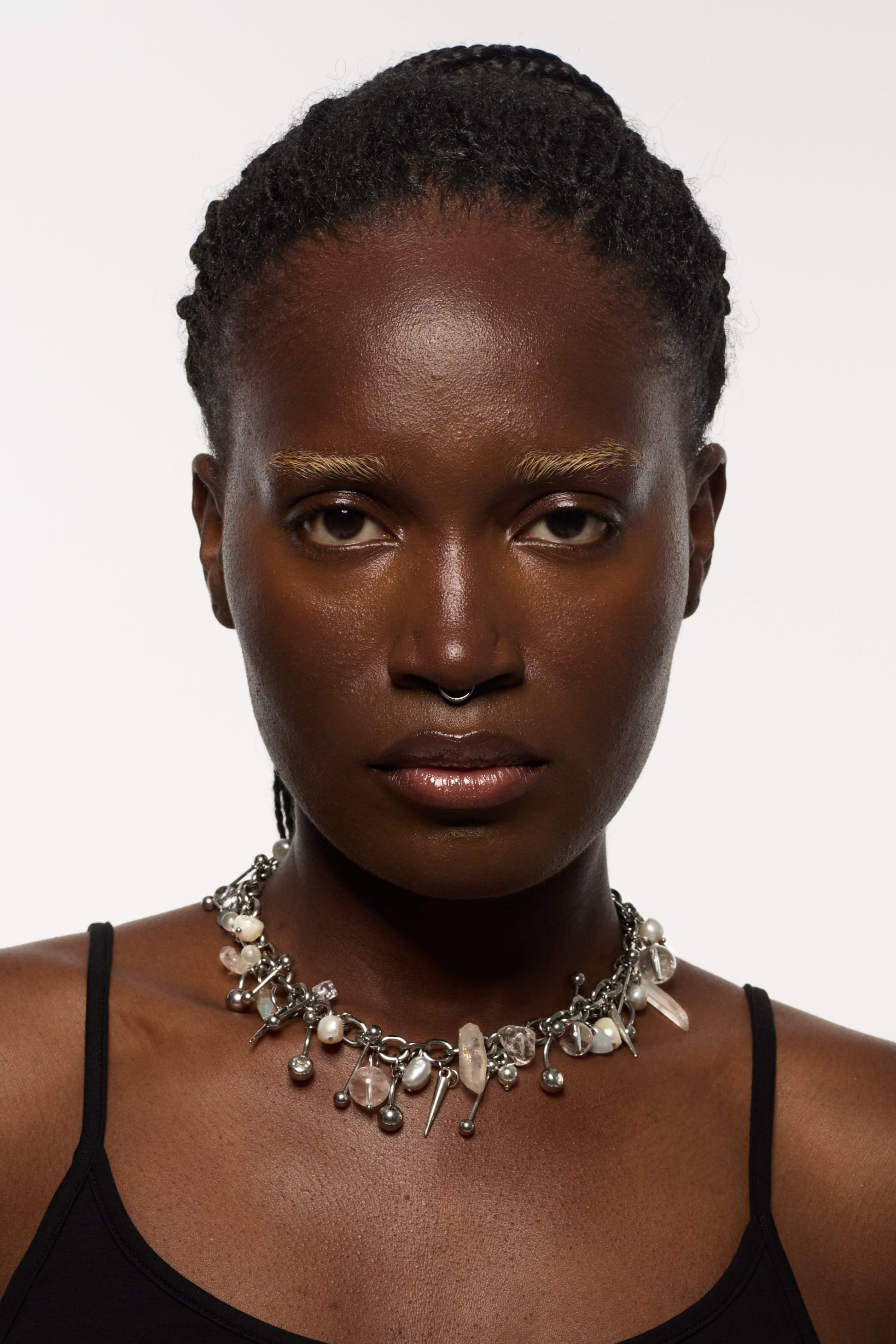 Necklace with multiple piercing, freshwater pearls, cristal pearls and quartz stones.