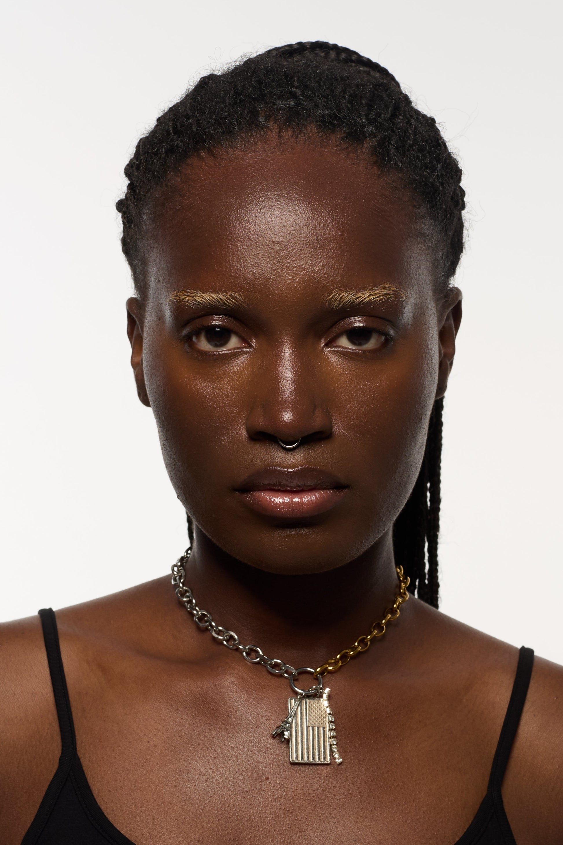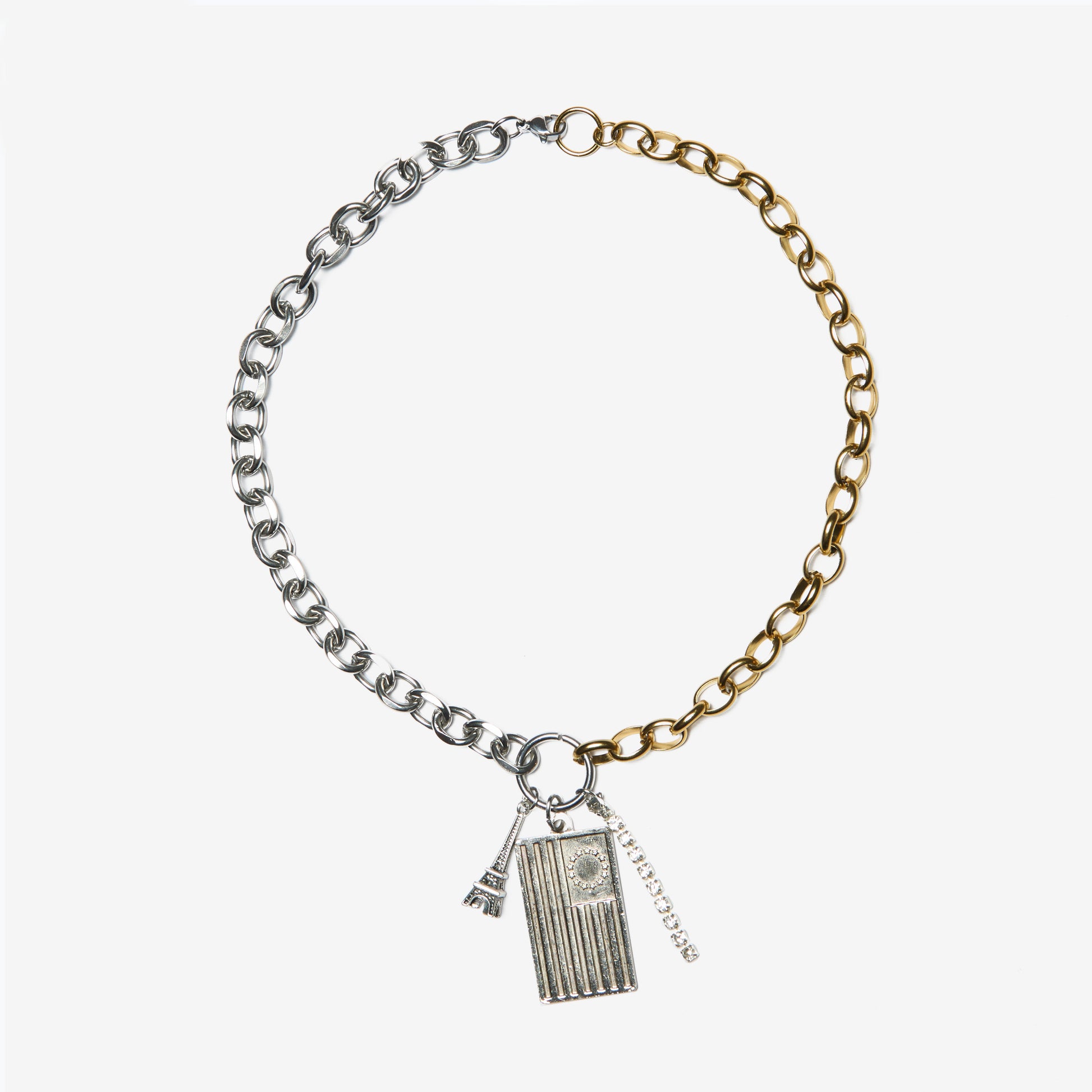Necklace with a golden an a silver chain, a metal charm, a rhinestone chain and a bold pendant repurposed from a vintage keychain.