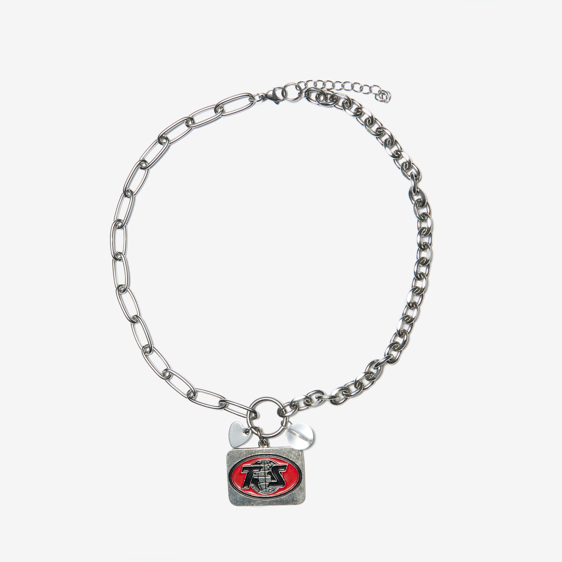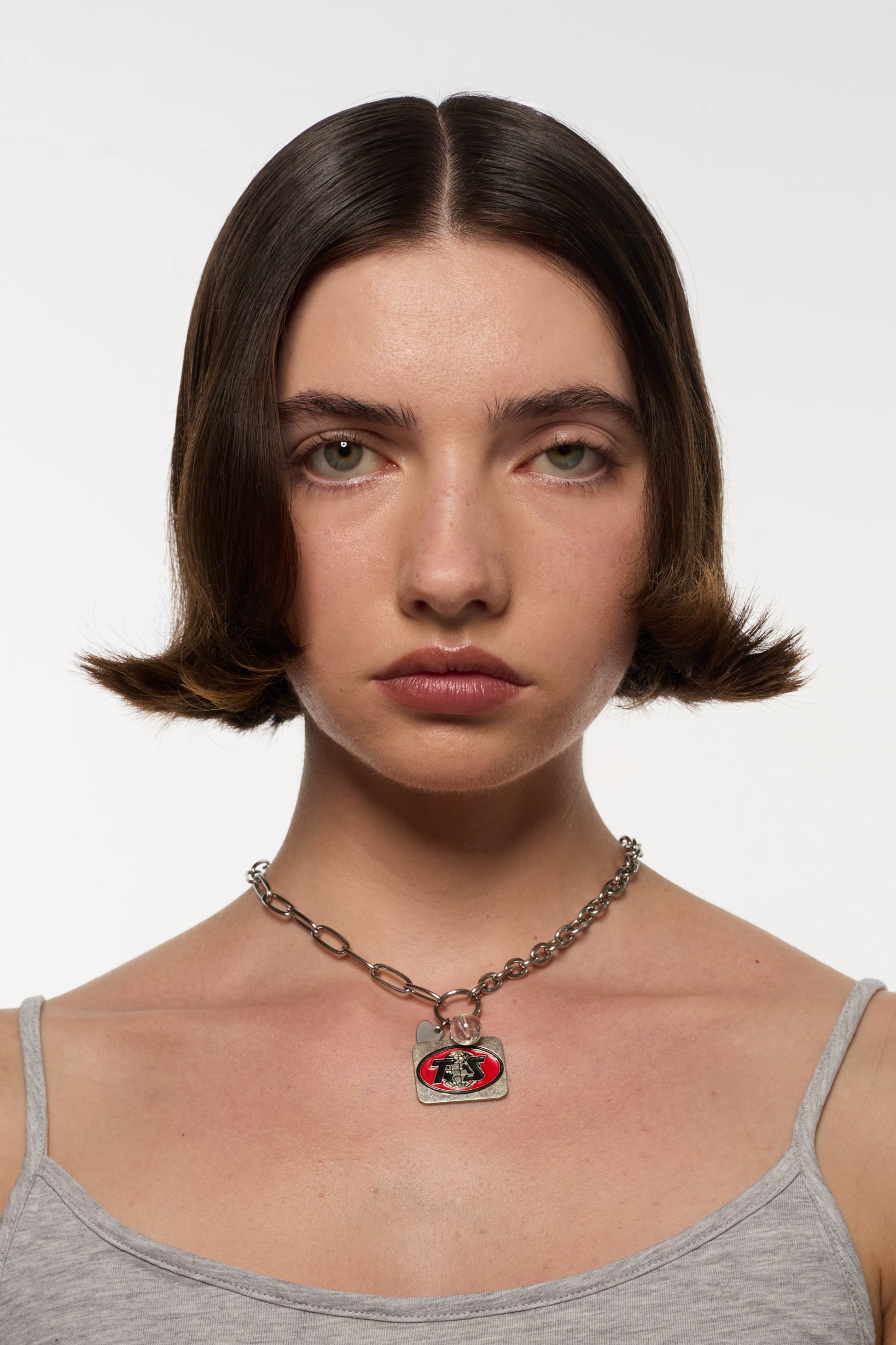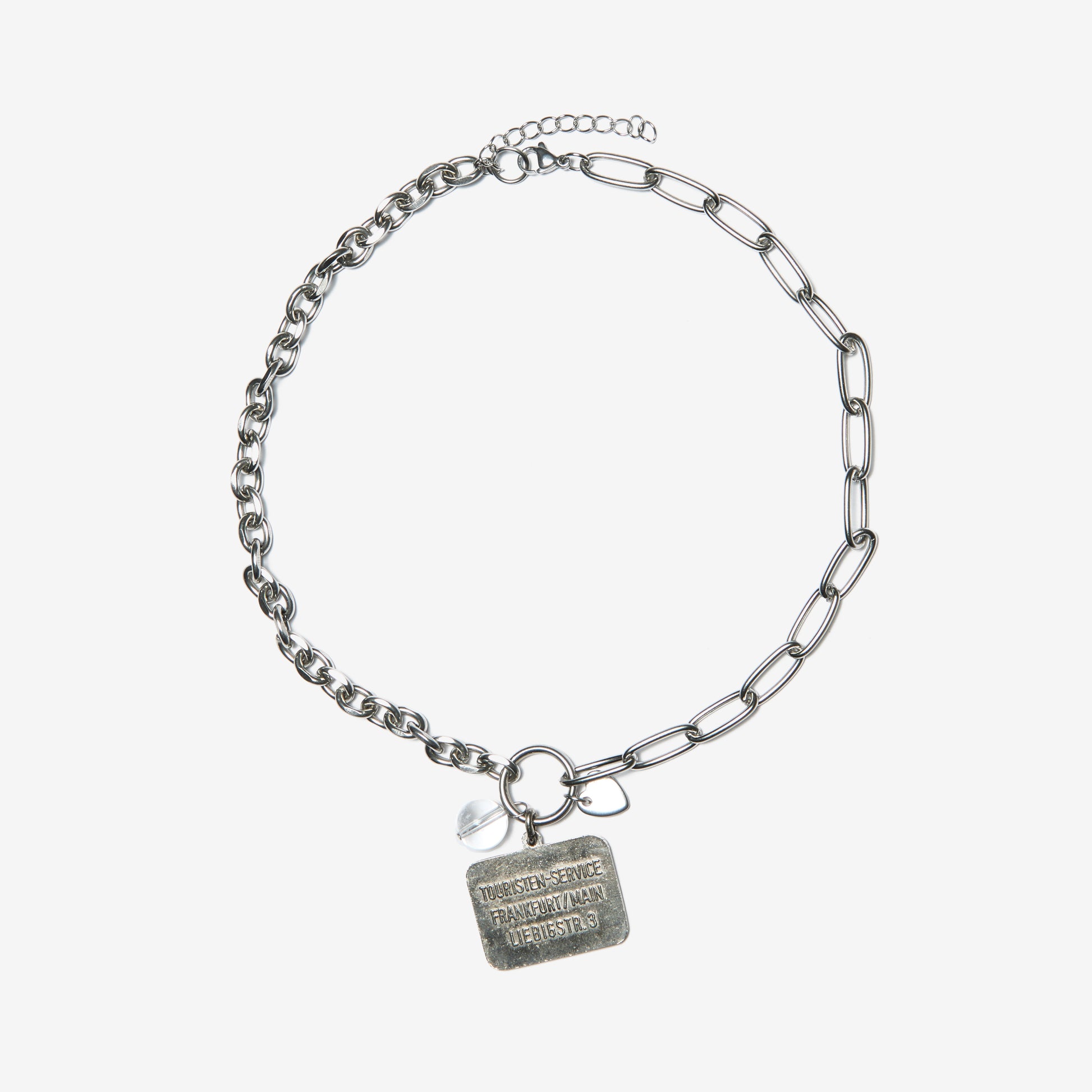 Necklace with two different silver chains, a quartz pearl and a bold pendant repurposed from a vintage keychain.