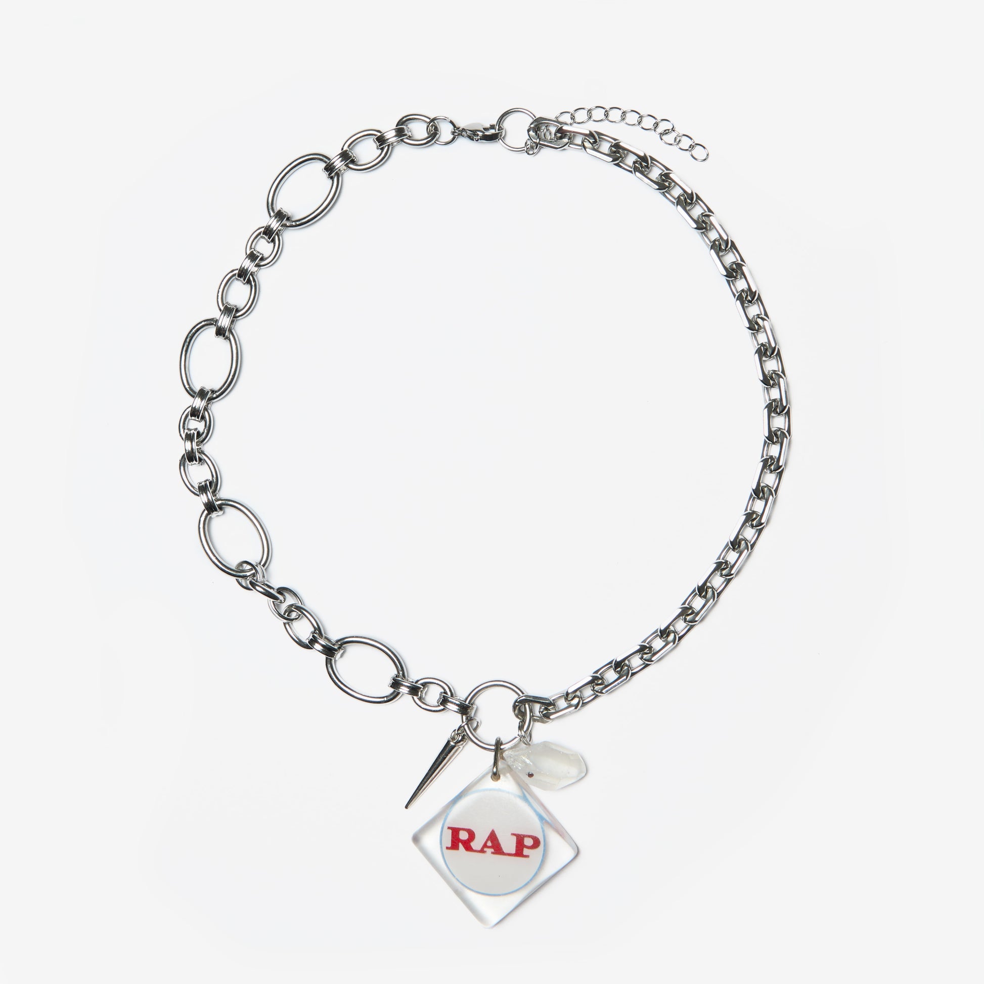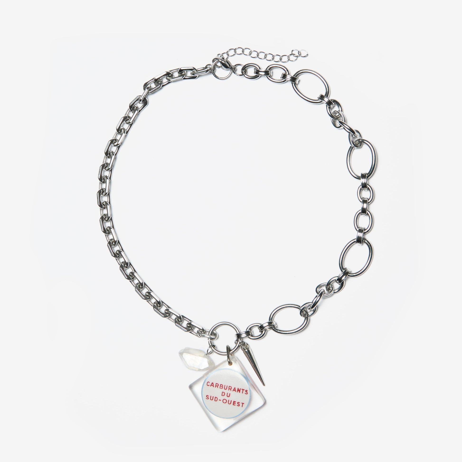 Necklace with two different silver chains, a quartz stone and a bold pendant repurposed from a vintage keychain.